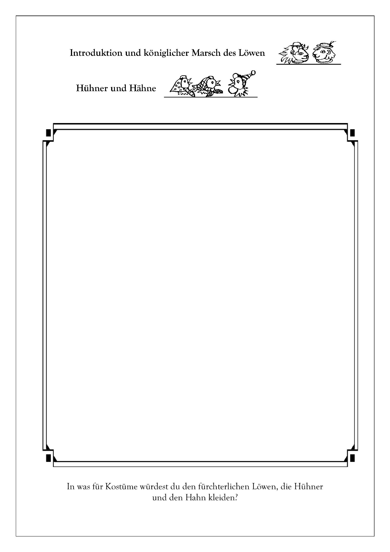 Im Heft sind lustige Zeichnungen und auch die Kinder können Zeichnungen in die vorgegebenen Bil-derrahmen über den Karneval der Tiere anfertigen.
